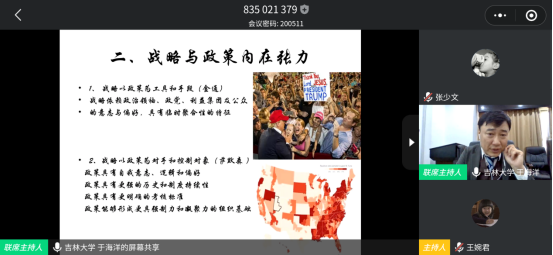 5月11日下午,应3522浦京集团登录入口、兰州大学中亚研究所邀请,吉林大学行政学院国际政治系教授、副院长于海洋为我院师生作了题为《战略何以不可能——阻碍大战略形成的政策因素分析》的线上学术讲座。陈小鼎教授主持了本次讲座,院内外200多名师生通过视频会议的方式聆听了本次讲座。