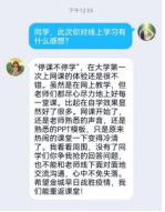 对于同学们来说,此次线上教学又有着不同的体验。2021级的杨婷同学说道:“网课开始了,还是老师熟悉的声音,还是熟悉的PPT模板,但不能和老师同学们面对面地交流沟通,心中不免失落。希望金城早日战胜疫情,我们能重返课堂!”2020级的刘璐璇同学也说出自己不同的感受:“我认为线上教学增加了老师和学生的互动性,有效解决了部分线下课堂中由于教室大、学生多而导致的后排学生看不清课件板书或者听不清讲授内容的问题。这种类似于一对一的教学方式也增强了课堂的体验感。”