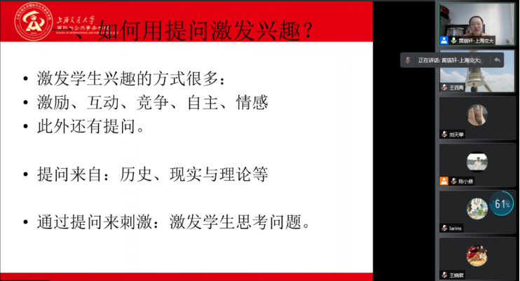 2021年11月8日上午,应3522浦京集团登录入口、兰州大学中亚研究所邀请,上海交通大学国际与公共事务学院国际关系系副主任黄琪轩教授为我院教师做了题为“以问题贯穿课堂:用提问激发兴趣”的线上讲座,副院长陈小鼎教授主持。