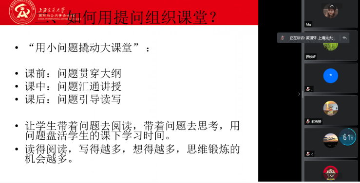 紧接着,黄琪轩老师讲解了如何用提问组织课程。主要包括三个方面:第一,课前用提问贯穿大纲;第二,课中用提问贯通讲授;第三,课后用提问引导读写。要让学生带着问题去阅读,带着问题去思考,用问题盘活学生的课下学习时间。读得越多,写得越多,想得越多,思维锻炼的机会就越多。
