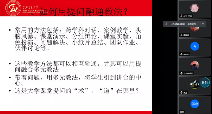 然后,琪轩老师结合案例详细介绍了大学授课的“术”——如何用提问通融教法。涉及跨学科对话、案例教学、头脑风暴、课堂演示、分组辩论、课堂实验、角色扮演、问题解决、小纸片总结、团队作业、伙伴讨论等多种常用教学方法。