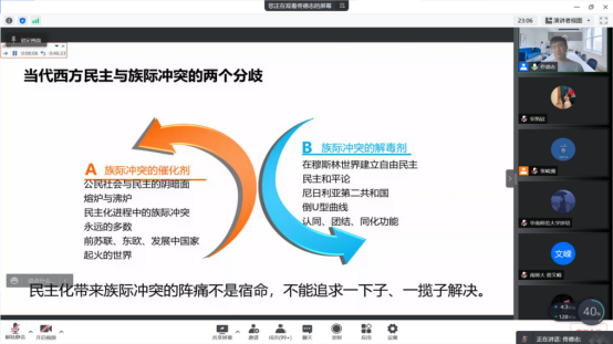 接着,佟老师指出,当代西方民主与族际冲突主要有两个分歧:一方面指的是民主化是族际冲突的催化剂,另一个方面强调民主化是族际冲突的解毒剂,两种解读都有其缘由。佟老师强调,民主化早期与族际冲突的加剧只是民主化进程中的阵痛,不能将其视为民主化的宿命。鉴于民主和民族问题在政治学当中的复杂性,民主化带给族际冲突的阵痛很难在短时间内得到有效的解决,因此应采取实用主义,本着具体问题具体分析的态度对民主化与族际冲突进行更全面的解读。