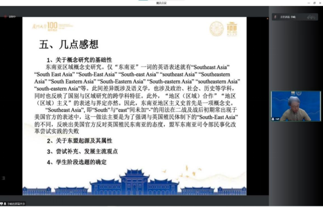 之后,李峰老师对自己所从事的东南亚区域研究作出一些学术感想:其一是以东南亚区域概念为例指出概念的研究是学术研究的基础;其二是勉励同学们在学术研究选题时尽量与导师研究方向接近,能够获得导师更多指导;其三是能够按照个人兴趣开展研究亦值得鼓励。