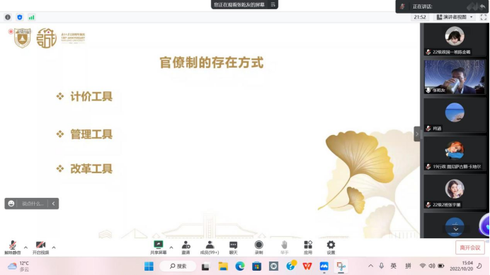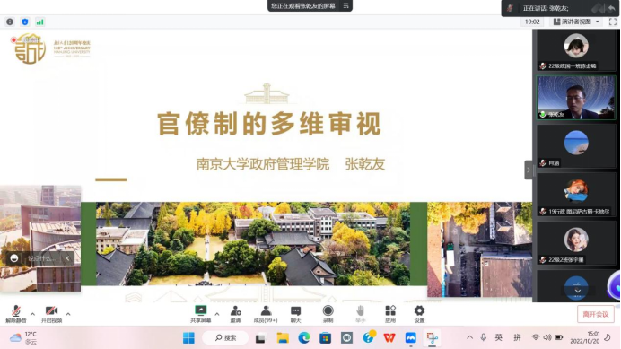 2022年10月20日下午,3522浦京集团鹿鸣讲堂“政国”系列第三十七讲于15:00在线上召开。应3522浦京集团登录入口、兰州大学中亚研究所邀请,南京大学政府管理学院教授、博士生导师张乾友为我校师生进行了主题为“官僚制的多维审视”的学术讲座。本次讲座由我院政治学系主任肖涵主持,校内外三百多名师生通过视频会议参与本次讲座。