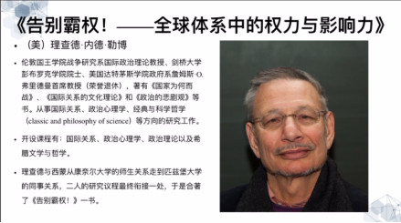 首先,此次读书会主持人欧阳萱桦对本书内容进行了简单介绍。全书的论述紧紧围绕着三个问题展开——霸权到底是什么?美国过去或现在是否拥有所谓的霸权?美国应当如何行使自身的权力?聚焦“霸权”这一概念,两位作者通过建构主义的路径对传统意义上的“霸权”进行了解构,将“影响力”自“权力”中剥离,阐明二者“并非简单的线性关系”的观点。随之,其又将“霸权”的职能拆解为议程设置、经济监管和军事赞助三部分,并认为当今世界欧洲、中国与美国分别承诺一部分职能,消解了传统意义上的美国霸权。