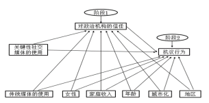 在得到图一的中介模型之前,我们首先将政治机构的信任建模为一般社交网络使用的函数(模型1)以及非政治和关键政治社交网络使用的函数(模型2);这两个模型都控制传统媒体的使用、性别、家庭收入、年龄、城市和地区。我们预计这两种情况都不会对社交媒体产生重大影响,因为作者的论点是,社交媒体对政治信任的影响及其最终对抗议的影响,取决于对关键/持不同政见者信息流的接触程度。模型3对此进行了测试;它在图一的中介模型的阶段1中表示。如果不信任在很大程度上源于关键的信息流,那么我们应该期待在这里产生的影响是显著和强烈的。