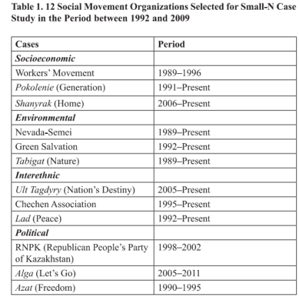 为了了解哈萨克斯坦抗议动员的性质,作者设计了一个小的多案例研究,研究了12个社会运动组织(政党、非政府组织、公共协会、社会运动)在1992-2009年间的活动与组织情况,其中的每一个案例都是抗议动员的代表。