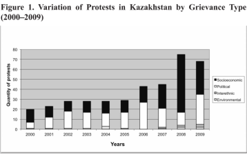 图1显示了越来越多的人愿意参与针对上述问题的公共抗议。我们可以看到,2000-2009年间哈萨克斯坦的大多数抗议活动是由社会经济和政治不满所驱动的。但是,强大的政府、有限的政治反对空间、社会对纳扎尔巴耶夫的崇敬心理以及高油价导致的经济增长,确保了政治稳定和政权的持久性。