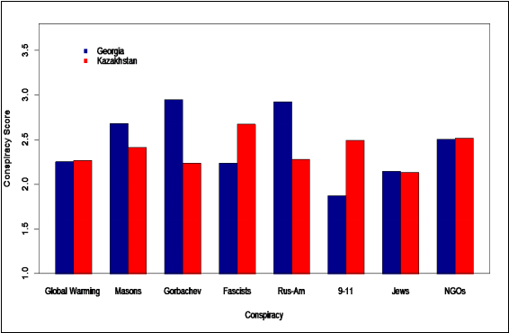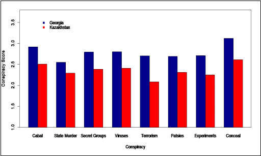 与其他国家相比,格、哈两国受访者通常更倾向于看到“阴谋”。例如,30%的美国人认为秘密组织控制着世界,相比之下,样本中有57%的格鲁吉亚人和50%的哈萨克斯坦人相信这一阴谋论。另一项研究发现,18%的英国受访者支持“全球变暖”阴谋论,而格鲁吉亚和哈萨克斯坦的这一比例分别为31%和38%。关于政府刻意隐瞒信息的问题,作者的一般性问题来源于一项研究,该研究发现,英国学生在5分制中得了3.86分,如果调整作者的4分制以符合他们的5分制,那么格鲁吉亚和哈萨克斯坦的得分分别为3.9分和3.2分。