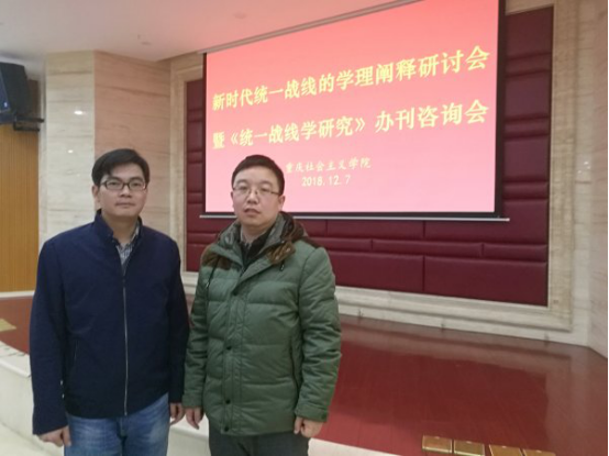 12月7日,“新时代统一战线的学理阐释探讨会暨《统一战线学研究》办刊咨询会”在重庆社会主义学院举办,有来自中央统战部、中央党校、中国社科院、南京大学、南开大学、山东大学、兰州大学、中央社会主义学院、上海师范大学、华东政法大学、西安财经学院等高校的十余位学者参加了此次研讨会,我院李捷副教授、曹伟博士应邀与会,并就反分裂斗争中的统一战线问题做了发言。