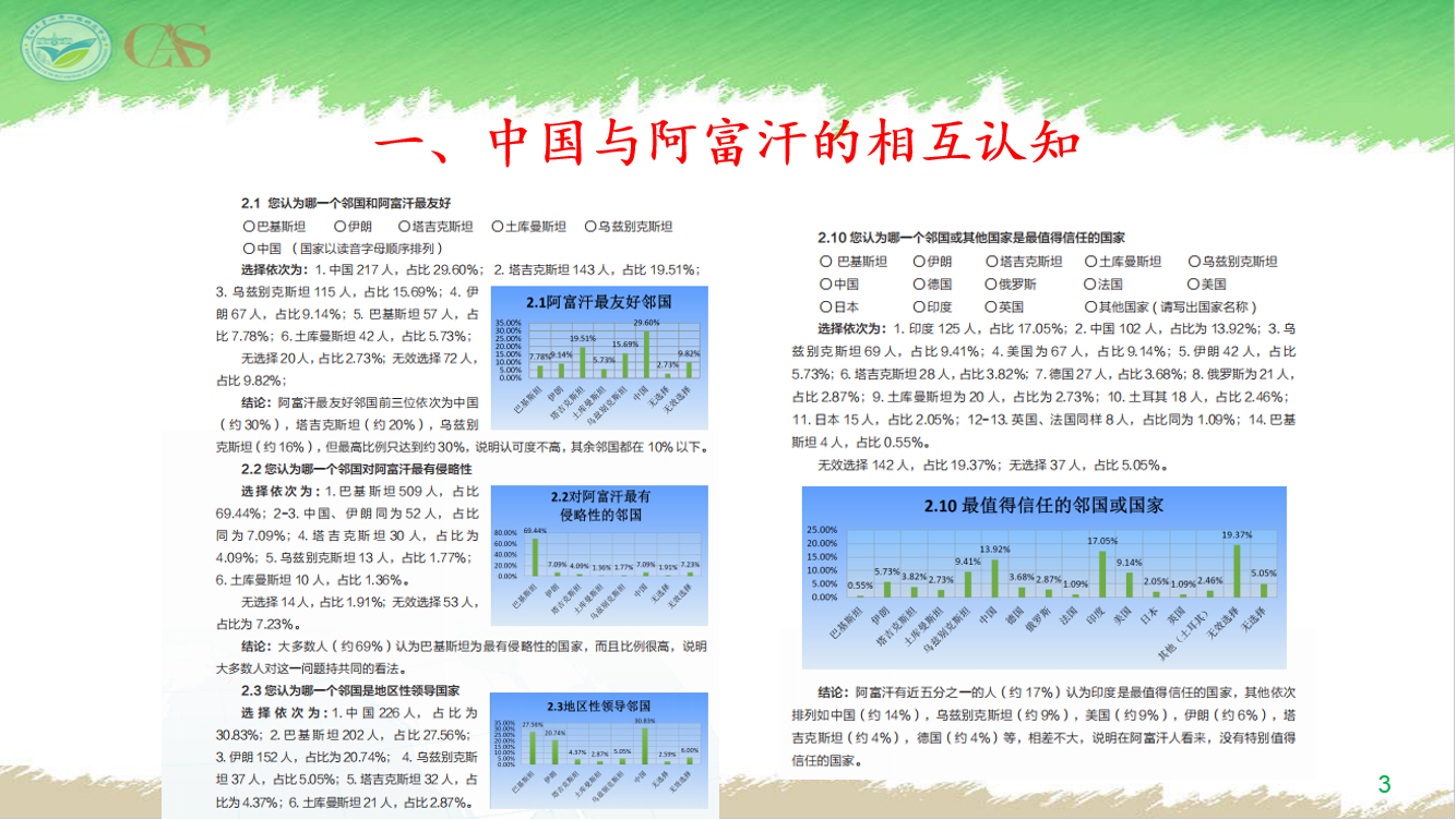 去年我们发布的一个报告显示,中国在阿富汗的形象还是比较好的。大家认为中国是阿富汗最好的一个邻国,当然在这个问题上,相对来说还是比较分裂,不同的人有不同的选择,并没有说哪个国家占有绝对的优势。