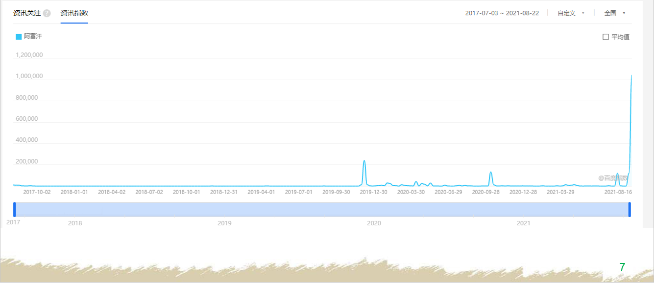 同时我们来看一下中国人对阿富汗的认知。我做了一个百度网站指数关键词的挖掘。大家可以看到,中国人搜的最多的20个关于阿富汗的关键词,第一个是阿富汗,第二个是阿富汗战争,第三个是阿富汗塔利班,接下来就是阿富汗地图、阿富汗总统、美国为什么打阿富汗、阿富汗的首都……这反映出很多人可能还不太清楚阿富汗的首都在哪,所以需要通过检索来核实一下。这些关键词的检索,事实上反映出中国人对阿富汗问题的兴趣。