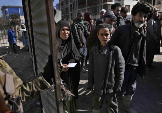 在阿富汗喀布尔,人们等待领取人道主义救援物资。新华社发