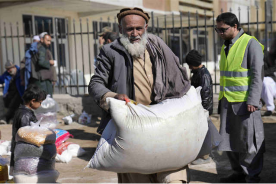在阿富汗喀布尔,一名男子领取人道主义救援物资。新华社发