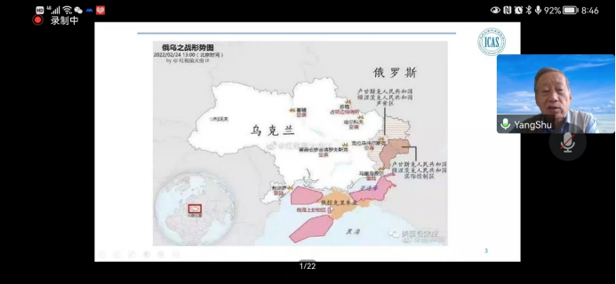 在主旨演讲环节,兰州大学原副校长、兰州大学中亚研究所所长杨恕教授以“俄乌冲突分析”为题对俄乌冲突对地区安全、国际秩序的影响进行了分析。杨恕教授指出,俄乌冲突是苏联解体后世界上影响最大的一次局部战争,它在各方面的影响都是全球性的。不过,我们需要长期努力才能明晰其长远影响。