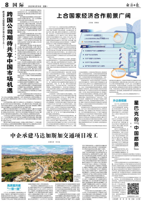 2022年9月19日,兰州大学土库曼斯坦研究中心主任王四海教授、助理研究员周筠松在《经济日报》发表题为“上合国家经济合作前景广阔”主题文章,刊于《经济日报》(2022年9月19日 星期一第八版),全文如下: