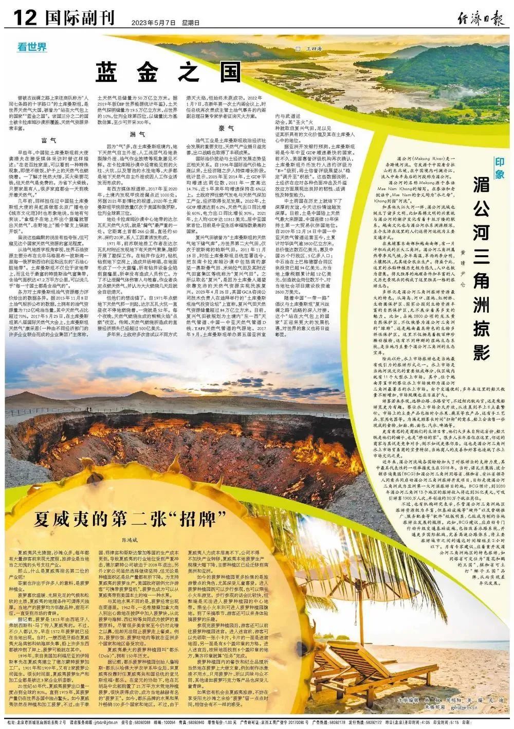 2023年5月7日,兰州大学土库曼斯坦研究中心主任王四海教授在《经济日报》发表题为“蓝金之国”文章,全文如下: