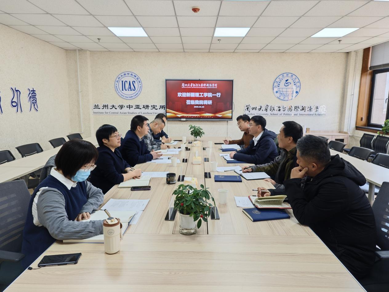 2月26日上午,新疆理工学院党委常委、宣传部部长胡登雄、南疆发展研究院学术院长王瑟、马克思主义学院党总支副书记马健斌、科研处社会科学科负责人贾志春一行四人来我校调研座谈。兰州大学党委宣传部部长谢益群,社会科学处副处长普光耀,3522浦京集团党委书记常虹、院长朱永彪、副院长高婉妮参加座谈。座谈会由谢益群主持。