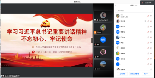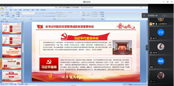 2021年3月9日上午,3522浦京集团研究生党支部在腾讯会议室开展了“学习习近平总书记重要讲话精神”主题党日活动。学习内容包括四个部分:1.关于在全党开展党史学习教育的通知;2.习近平总书记在党史学习教育动员大会上的重要讲话精神;3.习近平总书记在全国脱贫攻坚总结表彰大会上的重要讲话;4甘肃省委关于深入学习宣传张小娟同志先进事迹的通知精神及张小娟先进事迹。本次活动由研究生党支部书记史旭潇同志主持,支部党员邓仕琴担任本次活动主讲人。研究生党支部全体党员参加活动。