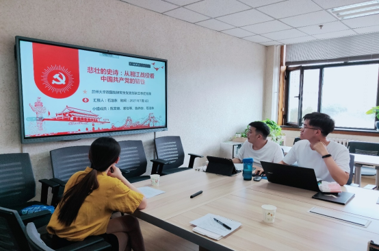 之后,支部党员进行党课学习。此次党课以“悲壮的史诗:从湘江战役看中国共产党的韧性”为主题。由石浩东同志带领小组成员制作、讲解。石浩东以“什么是湘江战役?”“湘江战役为何体现了中国共产党的韧性?”和“溯源中国共产党的韧性——追求平等的信仰”为主要部分。他的讲解从历史中走来,溯源伟大的湘江战役在我党发展史中的重大作用。联系当下实际,诠释中国共产党的伟大信仰。并穿插《觉醒年代》部分片段,以更加生动,更为感人的表达方式将此次学习专题活动推向高潮。