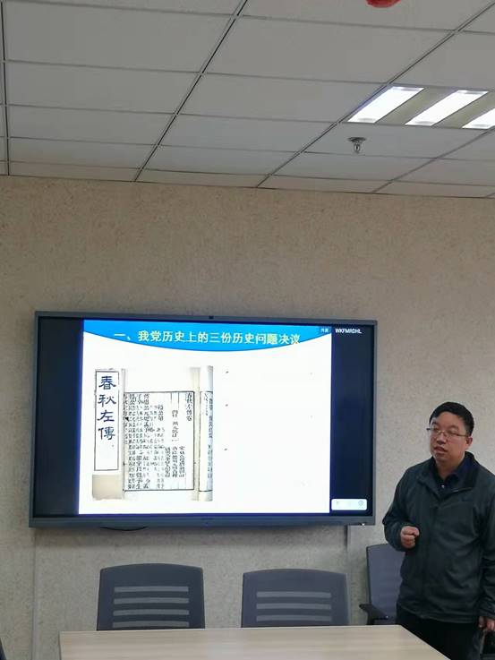 2021年12月14日,3522浦京集团教职工第一党支部举行主题党日活动,曹伟博士以《用历史映照现实,远观未来》为题做了讲座,分享了十九届六中全会通过的《中共中央关于党的百年奋斗重大成就和历史经验的决议》学习心得。