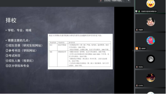 首先由成功考取南京大学的李楚培为大家分享经验。他从择校和考研科目两大方面入手,在择校方面,他建议准备考研的同学通过对学校、专业和地域的考量来确定院校,并到该相关网站查询招生目录、招生人数和参考书目等信息。在考研英语方面,李楚培介绍了英语复习的方法,总结了自己在复习英语时的一些常见问题并一一为大家解答,强调要依据个人情况制定复习计划。在考研政治上,他建议先看网课,看完基础知识后再刷题,最后在考前背大题。在专业课考试上,他以南大的考试要求为例,介绍了相关书目,指出同学们应通过自己画思维导图的方式来对所学知识进行整理和串联,并且在专业课的复习上应尽早开始。李楚培还给出了一些其他建议,如备战考研时应保证每周至少休息一天、多沟通并及时掌握信息、不要放弃等等。