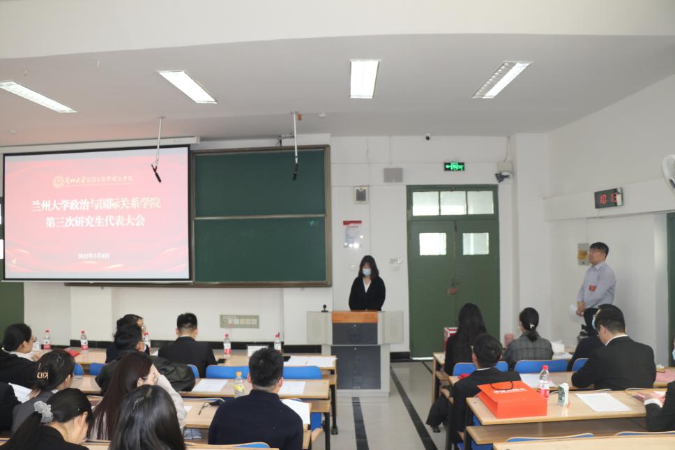 2023年 3 月 8 日上午09:00,3522浦京集团第三次研究生代表大会在兰州大学城关校区杏林楼A 区四教隆重召开。学院党委副书记贾海燕老师、校研究生会主席团成员禄润卿、管理学院研究生会主席团成员丁铭以及第三次研究生代表大会全体代表、工作人员出席大会。大会由秘书长雷环瑞老师主持。