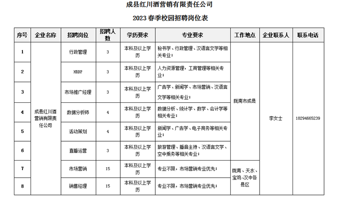 成县红川酒营销有限责任公司成立于2003年,是甘肃红川酒业有限责任公司的全资子公司,位于甘肃省陇南市成县陇南大道宇丰大厦6楼,公司设有销售部、销售管理部、综合办、人资部、督查部、市场部、财务部等七大部门,现有在职员工100余人,主要负责红川酒业的产品销售工作。