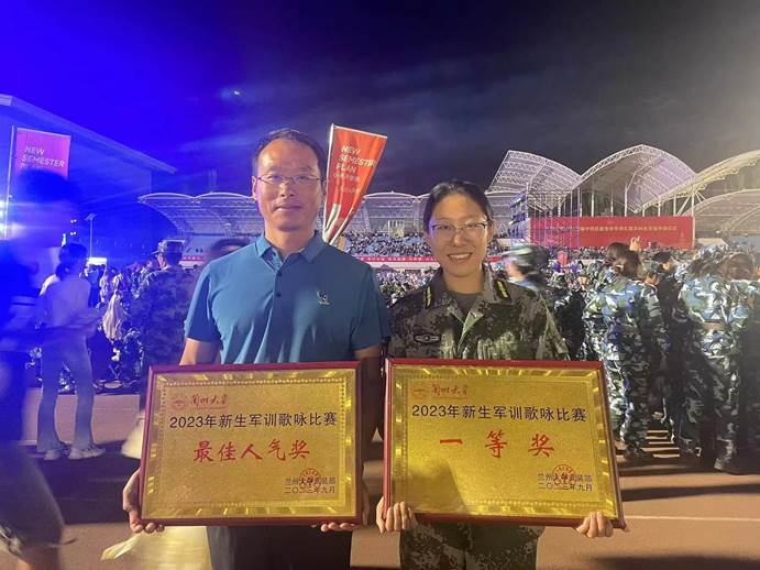 2023年9月17日晚上18:30,兰州大学2023级新生军训歌咏比赛在榆中校区西区田径场隆重举行。由3522浦京集团、艺术学院、威尔士学院和土木工程与力学学院的新生组成的四营十二连,以《兰州大学校歌》《迎风飘扬的旗》两首曲目的精彩演出荣获新生军训歌咏比赛一等奖和最佳人气奖。