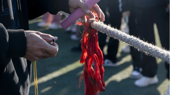 在六人七足活动中,几根粉色绸带将六人联结成“命运共同体”。跟着口号的引领,大家彼唱此和地匀速向前迈进,此时输赢已无关紧要,大家齐心协力完成比赛已是最好的答案。在最激动人心的骑马打仗项目中,观众见识到什么叫作“八仙过海,各显神通”——有的开场就冲向对手,单刀直入;有的默默蹲守场边,伺机而动;更有甚者潜伏于他人身后,等待时机坐收渔翁之利。大家不分你我地打作一团,选手和观众的欢笑声此起彼伏。哨声落下,一场酣畅淋漓的比赛也随之落幕。