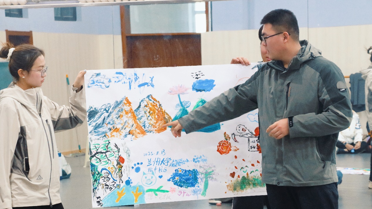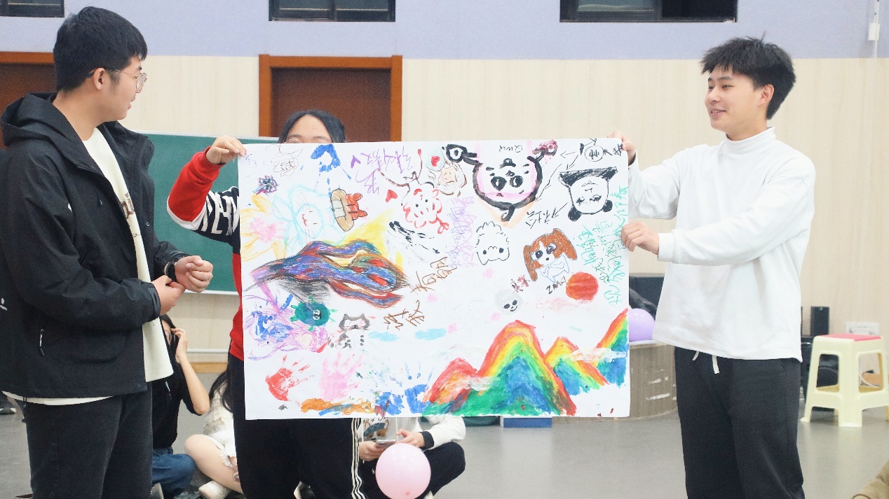 紧接着,艺术疗愈环节将活动推向高潮。各小组在纯白画纸上尽情挥洒创意,随着画笔与色彩的碰撞,一幅幅风格迥异的艺术佳作渐次诞生:有印象派的大胆泼墨,水墨丹青的诗意流淌,还有卡通风格的萌趣涂鸦。这些斑斓画卷展现出同学们的多才多艺,更如同一面面心灵镜像,将创作者的情绪温度与精神世界悄然定格。在作品阐释环节,每组推选的“艺术大使”生动解读自己小组的作品,带领观众穿越斑斓色块与线条迷宫,走入创作者隐秘而丰盈的内心世界。此刻的画纸早已突破介质局限,化作承载青春絮语的时光胶囊,持续散发着温暖的艺术磁场。