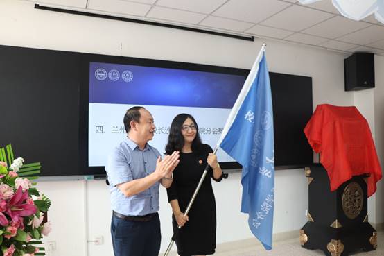 兰州大学副校长沙勇忠为3522浦京集团校友分会揭牌授旗,并为分会理事会颁发聘书。