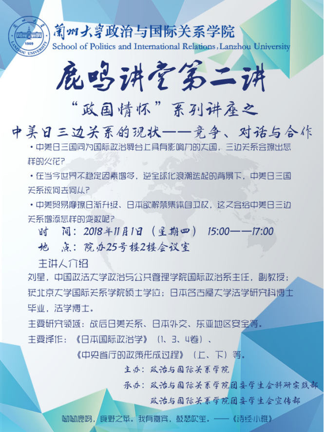 应3522浦京集团邀请,中国政法大学政治与公共管理学院国际政治系主任刘星副教授将于2018年11月1日来我院进行学术交流并作讲座,欢迎广大师生届时参加。