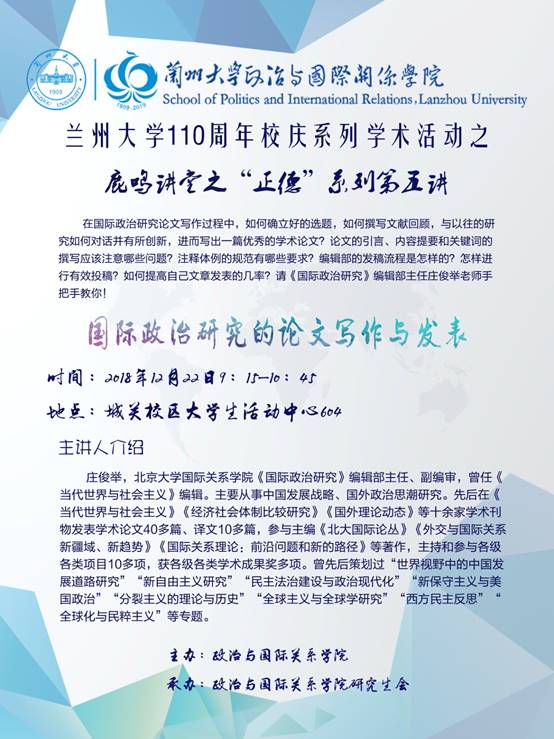 应3522浦京集团邀请,北京大学国际关系学院《国际政治研究》编辑部主任、副编审庄俊举老师于2018年12月22日来我院进行学术交流并作讲座,欢迎广大师生届时参加。