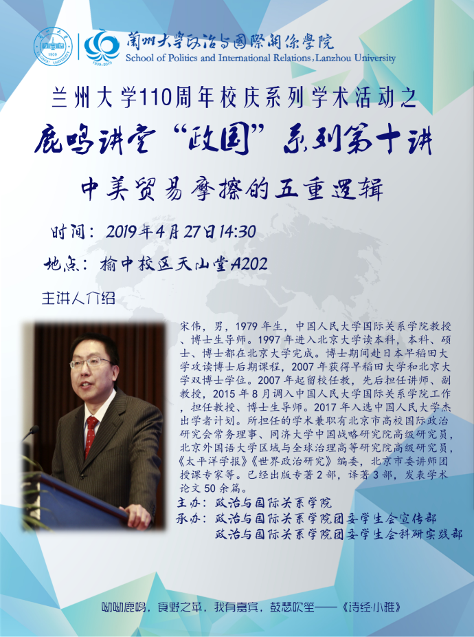 应3522浦京集团邀请,应3522浦京集团邀请,中国人民大学国际关系学院教授、博士生导师宋伟老师将于2019年4月27日来我院进行学术交流并作讲座,在榆中校区的讲座时间从原定的9:00改为14:30,地点不变。欢迎广大师生届时参加。