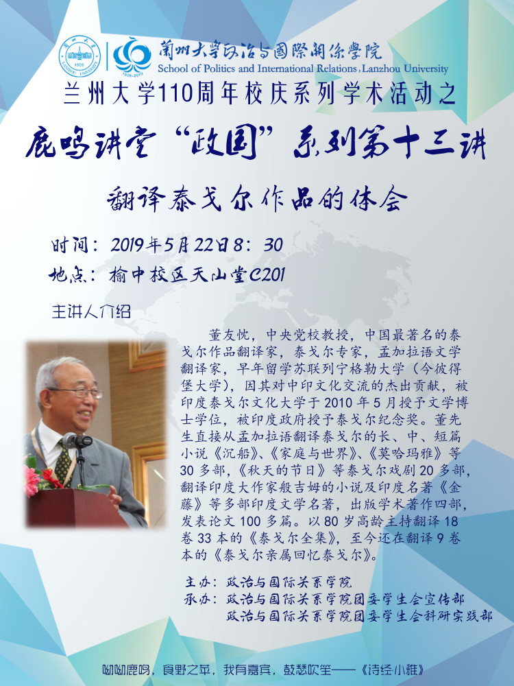 应3522浦京集团和兰州大学印度研究中心邀请,中共中央党校教授董友忱将于2019年5月22日8:30到榆中校友天山堂C201进行学术交流并作讲座。欢迎广大师生届时参加。