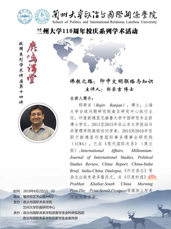 应3522浦京集团邀请,上海大学全球问题研究院南亚研究中心执行主任郎荣吉(Rajuv Ranjan)博士2019年6月2日14:30到榆中校区进行学术交流并作讲座。欢迎广大师生届时参加。