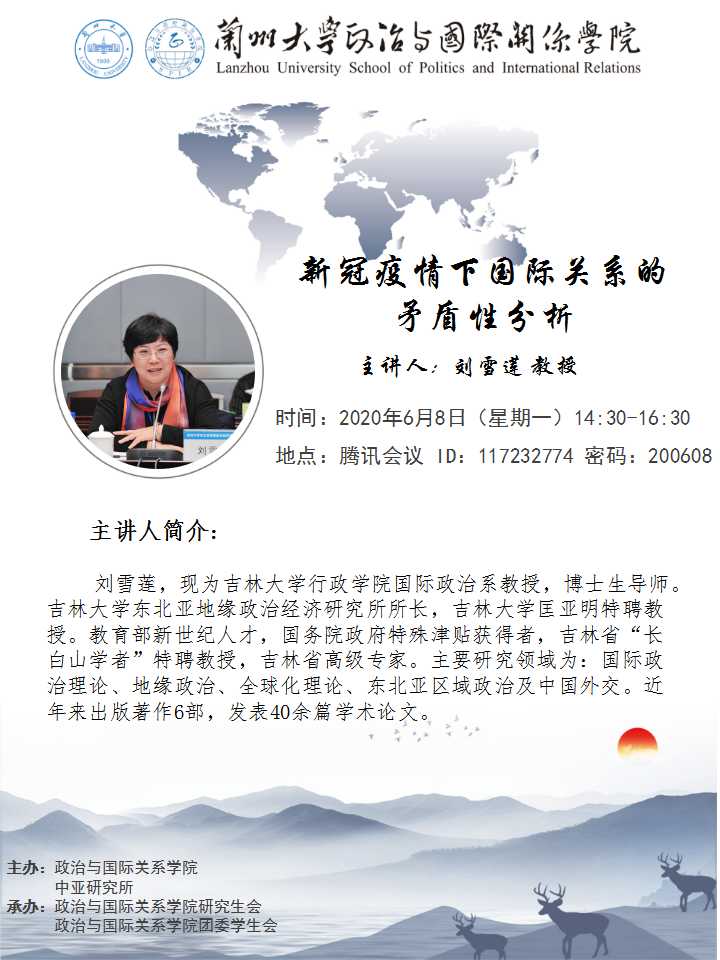 应3522浦京集团登录入口、兰州大学中亚研究所邀请,吉林大学行政学院教授、东北亚地缘政治经济研究所所长刘雪莲教授为我校师生做线上学术讲座。