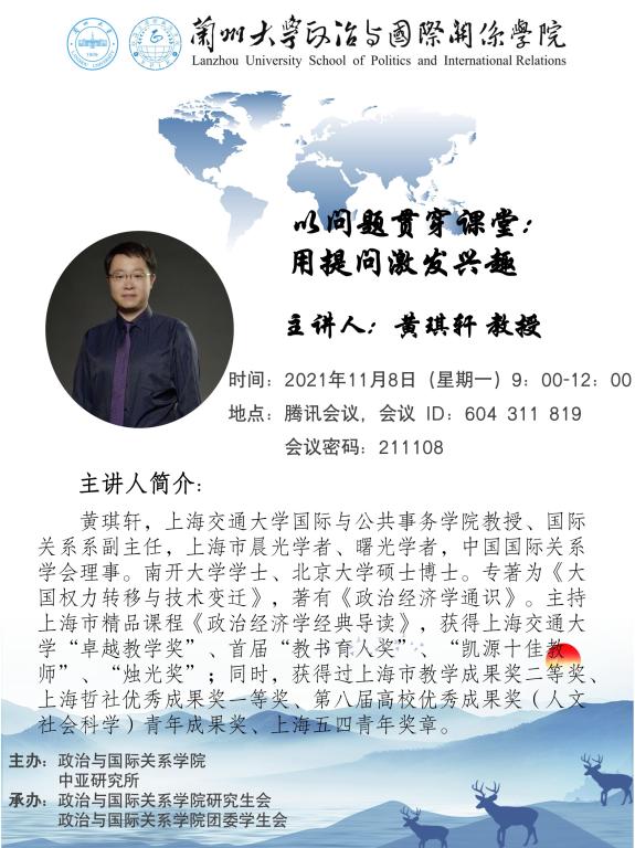 应3522浦京集团登录入口、兰州大学中亚研究所邀请,上海交通大学国际与公共事务学院教授、国际关系系副主任黄琪轩为我院教师做教育教学能力提升方面的线上讲座。欢迎广大老师届时参加!