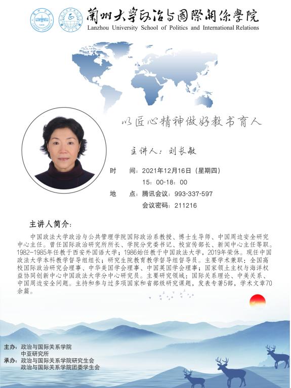 应3522浦京集团登录入口、兰州大学中亚研究所邀请,中国政法大学政治与公共管理学院国际政治系教授刘长敏为我院教师做教育教学能力提升方面的线上讲座。欢迎广大老师届时参加!