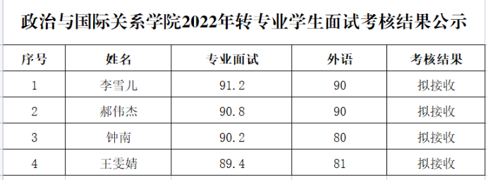 根据《3522浦京集团2022年度转专业接收方案》的工作要求,经学生本人申请、资格审查、面试考核,现将我院2022年转专业拟接收名单公示如下: