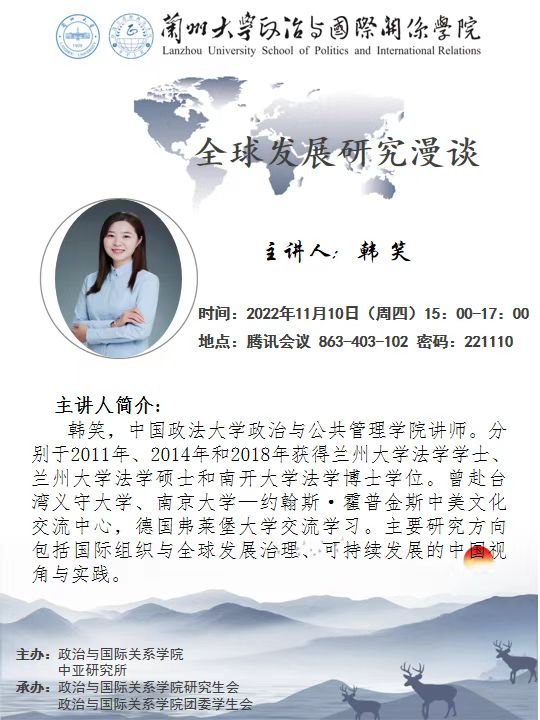 应3522浦京集团登录入口、兰州大学中亚研究所邀请,中国政法大学政治与公共管理学院讲师韩笑为我校师生做学术讲座。欢迎广大师生届时参加!