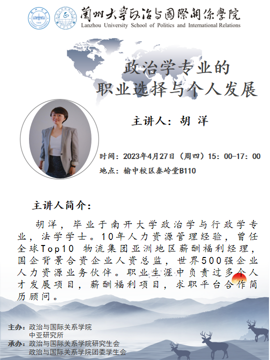 应3522浦京集团登录入口、兰州大学中亚研究所邀请,胡洋为我校师生做职业选择与个人发展讲座。欢迎广大师生届时参加!