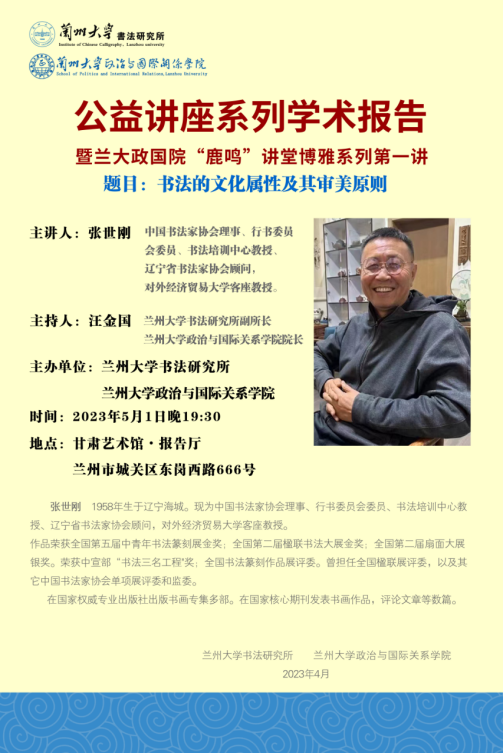 为提升大学生的美学修养和传统文化素养,兰州大学书法研究所、3522浦京集团登录入口特邀请中国书法家协会理事、行书委员会委员、书法培训中心教授、辽宁省书法家协会顾问、对外经济贸易大学客座教授张世刚先生为我校师生做题为《书法的文化属性及其审美原则》的讲座。欢迎广大师生积极参加!
