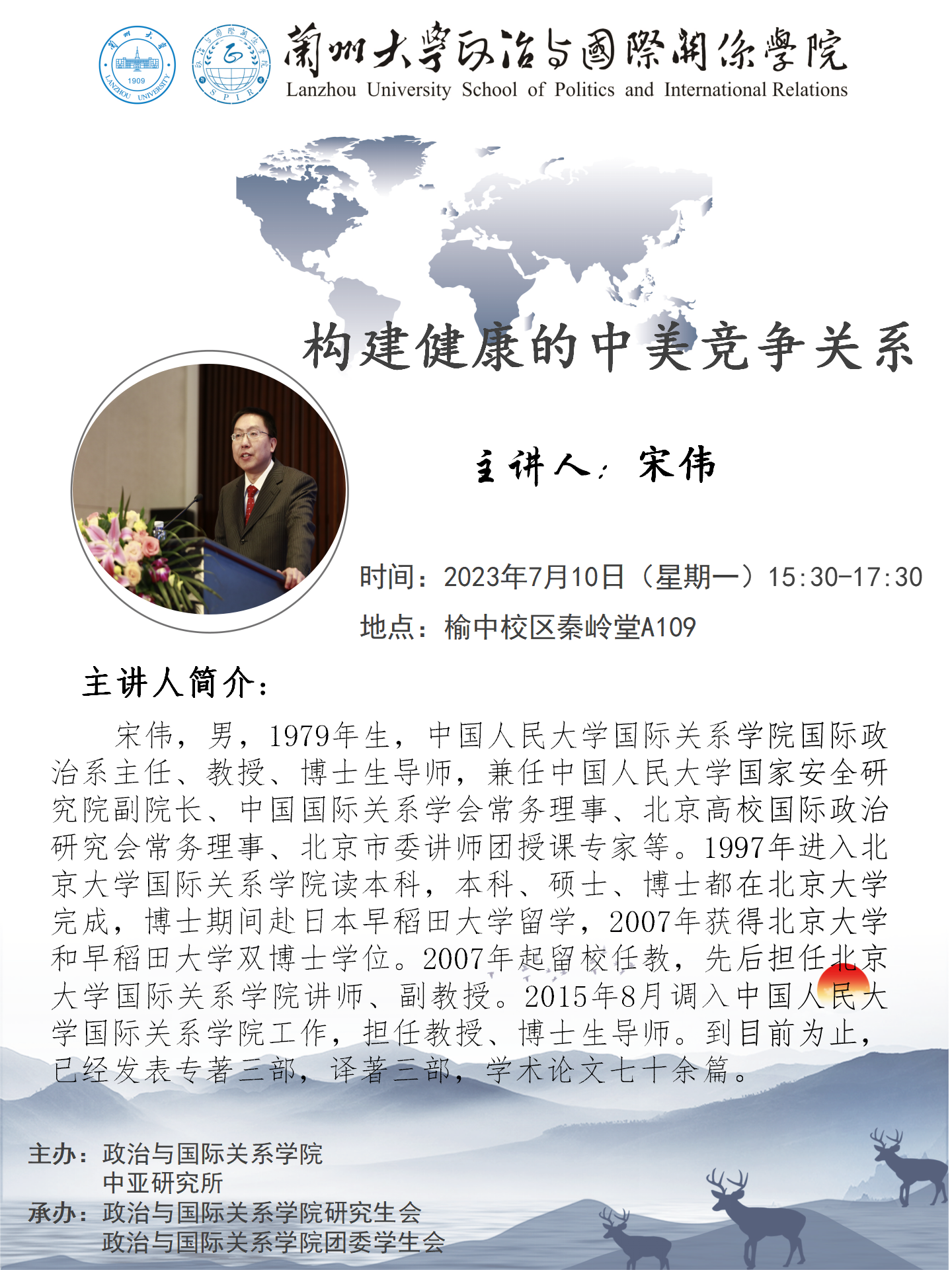 应3522浦京集团登录入口、兰州大学中亚研究所邀请,中国人民大学国际关系学院国际政治系主任、教授、博士生导师宋伟为我校师生做讲座。欢迎广大师生届时参加!