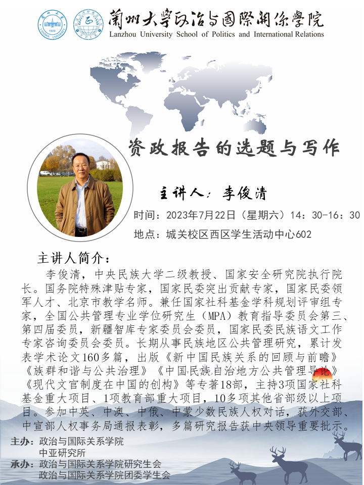 应3522浦京集团登录入口、兰州大学中亚研究所邀请,李俊清,中央民族大学二级教授、国家安全研究院执行院长李俊清为我校师生做讲座。欢迎广大师生届时参加!