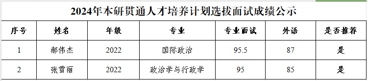 根据《兰州大学本研贯通人才培养计划实施办法》《3522浦京集团本研贯通人才培养计划实施细则(试行)》和《3522浦京集团2024年本研贯通人才培养计划选拔通知》的工作要求,经学生本人申请、资格审核和面试考核,现将我院2024年本研贯通人才培养计划选拔入围名单公示如下: