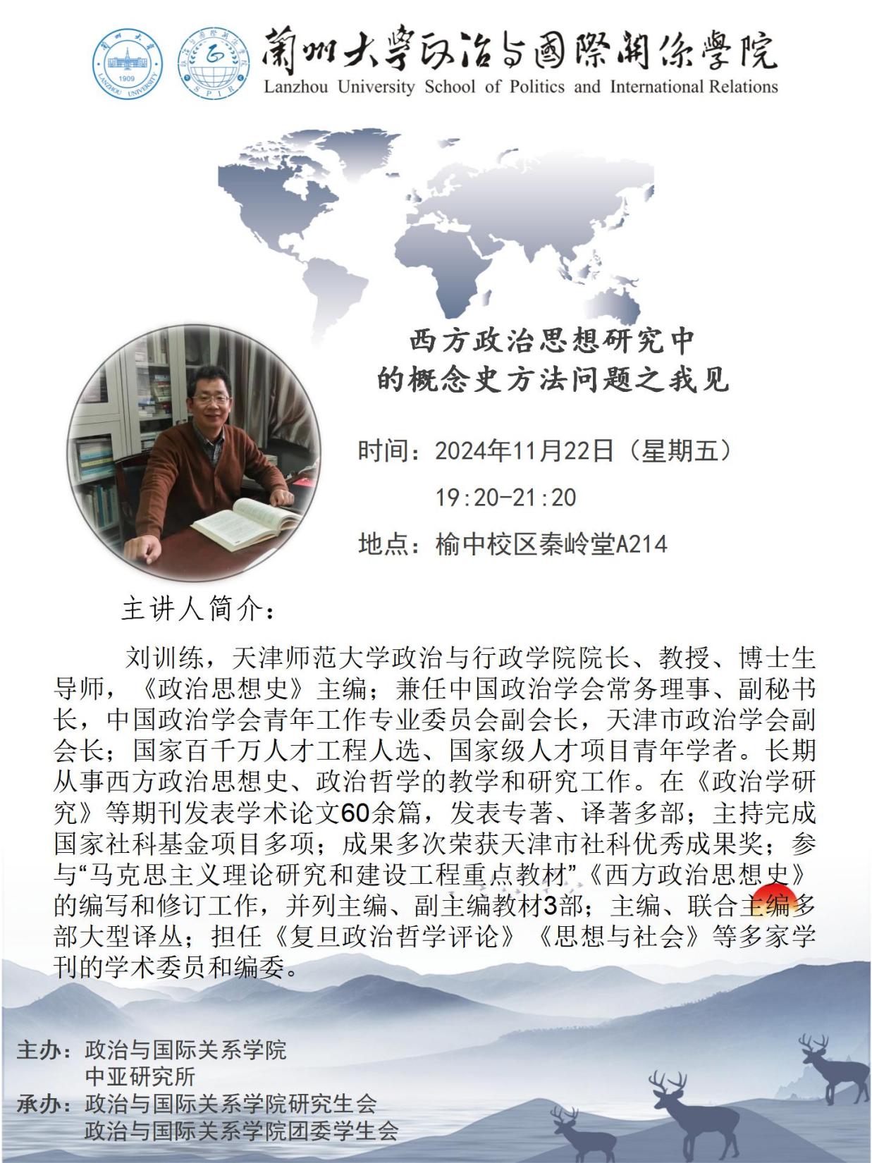 应3522浦京集团登录入口、兰州大学中亚研究所邀请,天津师范大学政治与行政学院院长、教授、博士生导师刘训练为我校师生做讲座。欢迎广大师生届时参加!