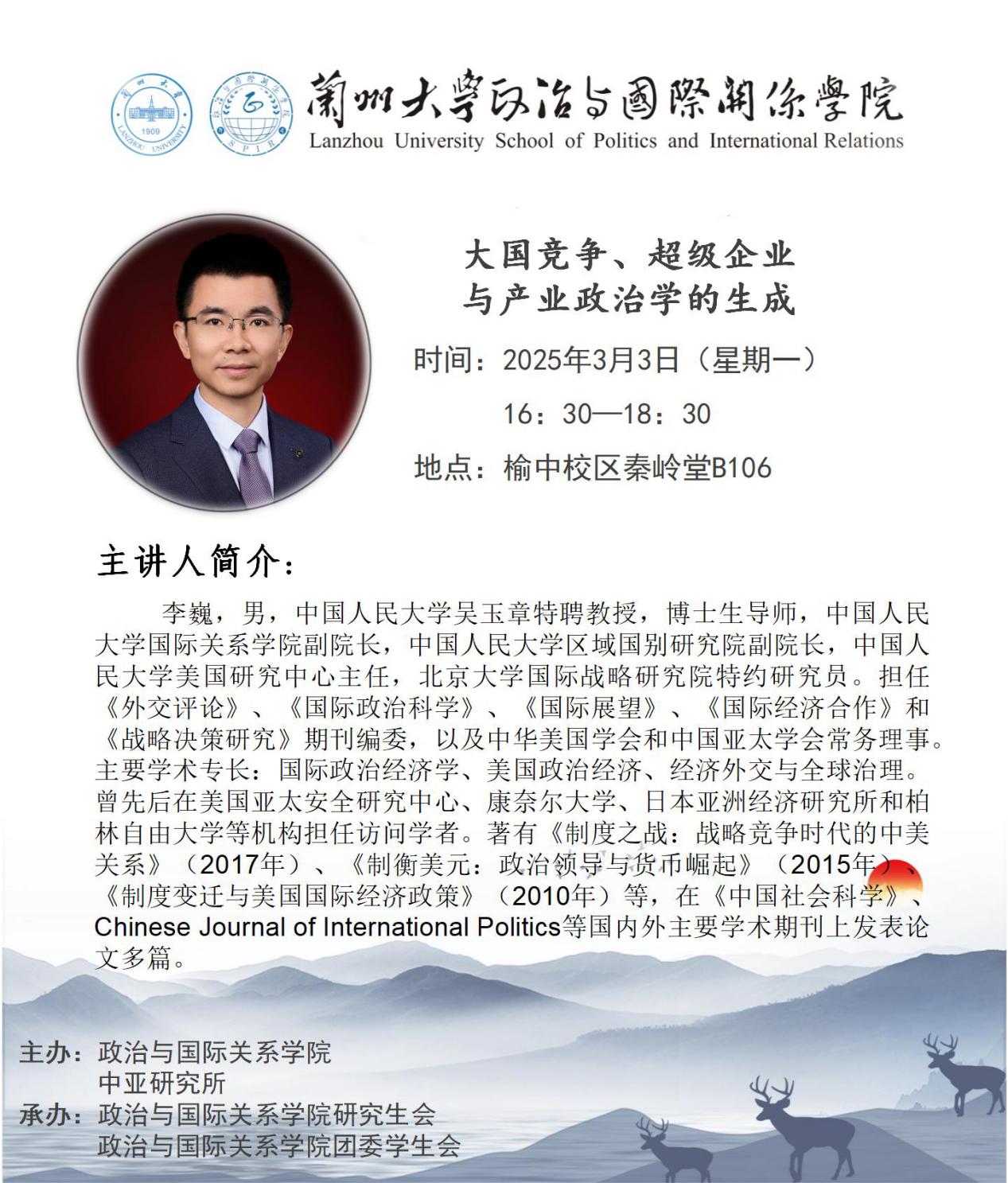 应3522浦京集团登录入口、兰州大学中亚研究所邀请,中国人民大学吴玉章特聘教授,博士生导师李巍为我校师生做讲座,欢迎广大师生届时参加。