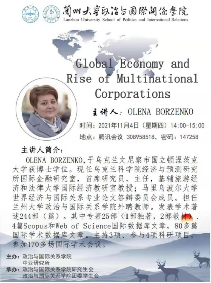 Invited by the School of Politics and International Relations of Lanzhou University and the Institute for Central Asian Studies, Olena Borzenko, Researcher at the Institute of Economics and Forecasting of the Ukrainian Academy of Sciences,will give an academic lecture for the teachers and students of our school. All teachers and students are welcome to attend.